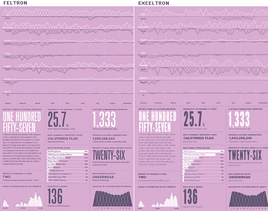 Can we take a page out of Nicholas Felton's book and make it happen in Excel? Well, here is what happens if you use Excel's default charts to show some of his data.