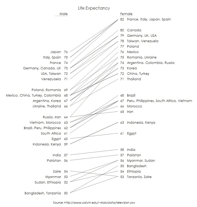 Not only can you see the countries' rankings and relative values, but it is also easy to see aberrations (Zaire where men live longer than women), patterns (countries with higher life expectancies have a bigger difference between men and women), and comparisons (Russia v. Iran is my favorite).