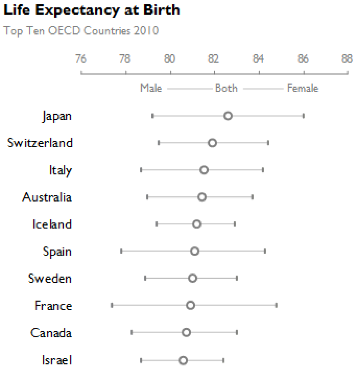 It’s very simple - it ranks total life expectancy at birth for the top ten OECD countries. I can quickly see that Japan is the longest-living population overall, but not Japanese men. I can also see that Iceland and Israel have the narrowest difference in expectancy for men and women. The chart is clear and information-dense. In fact, I’m going to give it a clarity score of four out of five.