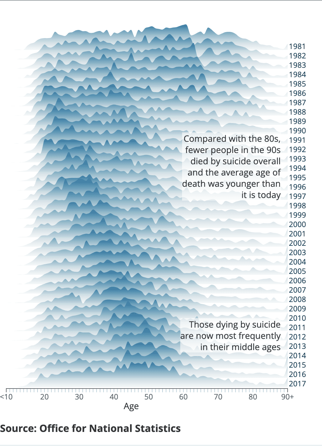 The visualization below shows the number of suicides by single year of age, England and Wales, deaths registered between 1981 and 2017.