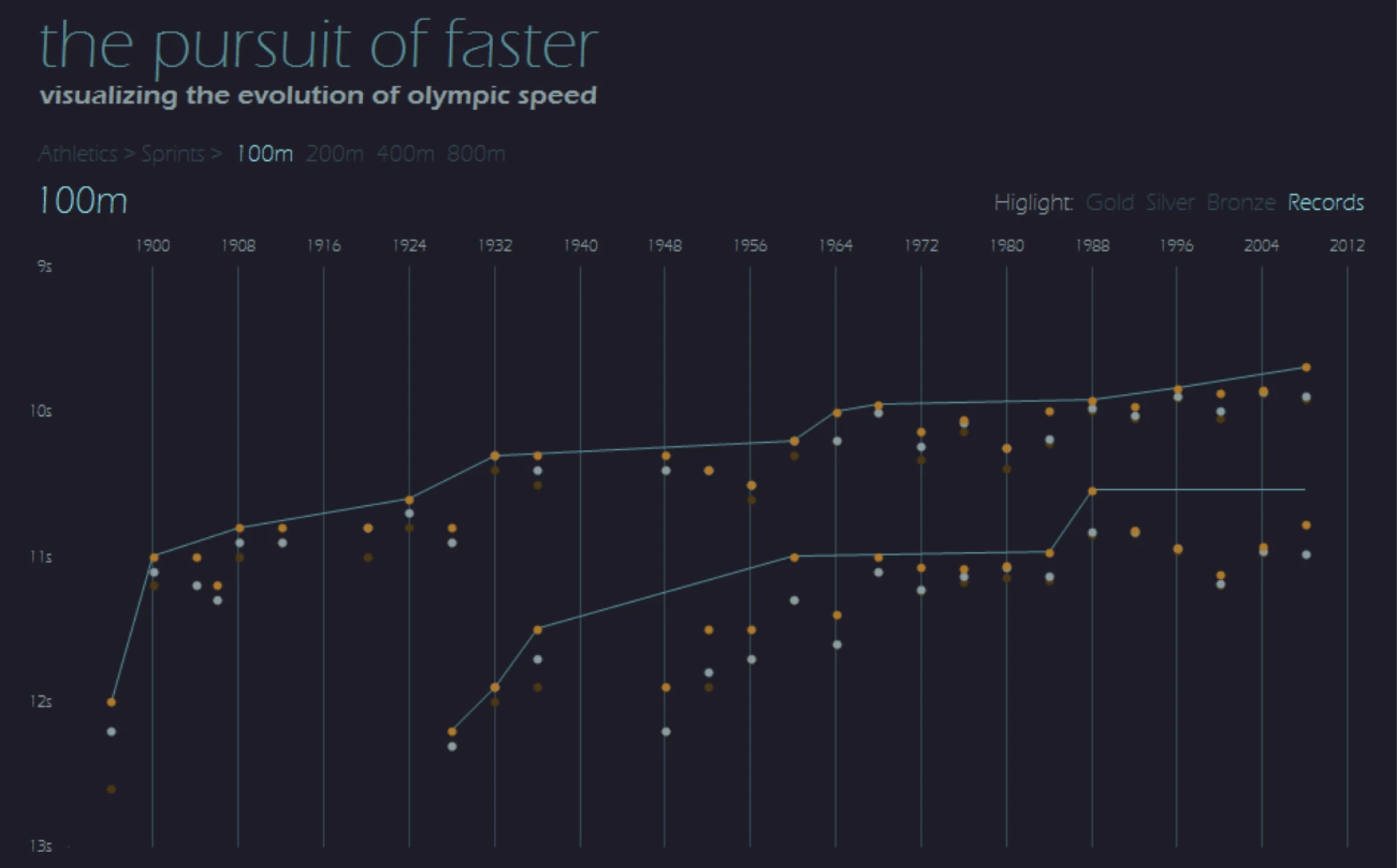 There’s even more information in this one, but it’s equally accessible. I can instantly see the trend in Men’s and Women’s 100m times. I can see how often the gold medal is a new world record. I can see the large plateaus where athletes didn’t improve substantially. I can see that the gap between men and women has narrowed over time. I’ll give it a 4.5 for clarity.