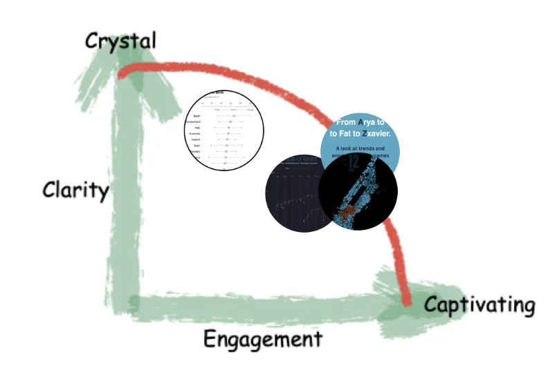 Notice how there is still some tradeoff between Clarity and Engagement. One cannot create a visualization both perfectly clear and perfectly engaging (above and to the right of the red line). Nevertheless it seems that to some degree, we can have our cake and eat it too.