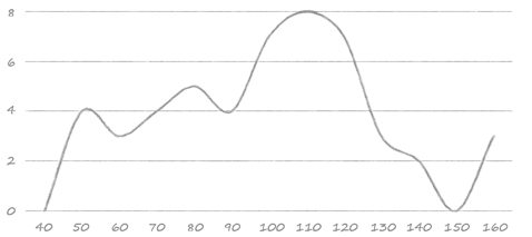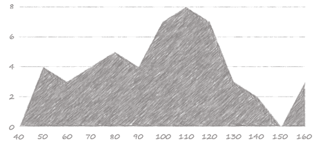 If we take the beeswarm plot and organize the dots into bins of ten, for instance, we get a unit chart. Like the previous charts, unit charts can give a sense of volume if each represents a single point or some round-numbered multiple.