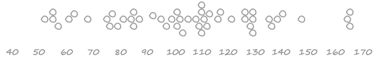 It’s a sideways histogram, but with all the data encoded in it. Once you know how to read it, it is quite powerful. In this example, the first row is the 4 data points in the 50’s from our data set: 52, 55, 55, and 57. It’s only useful for smaller data sets, but I wish I saw it more often. R will produce these quite easily but, sadly, few other tools do the same.