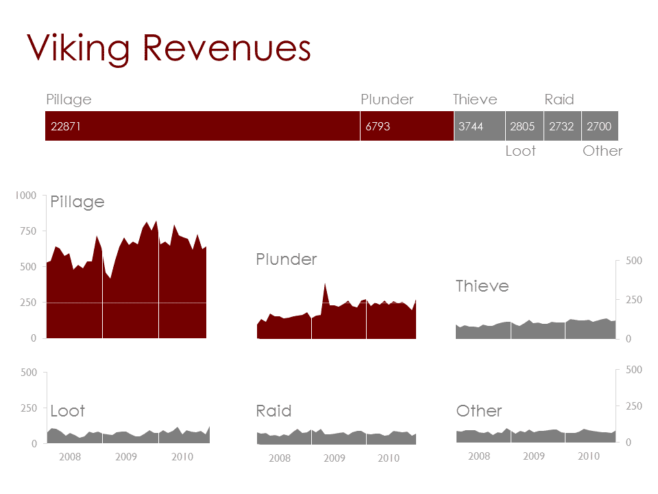 Don't be afraid of small things The solution in this case is to simply make a small chart for each series. Often called "small multiples" these charts reveal the patterns for each series and let us compare between the series. To give a sense of the proportions of the different series we can add another chart specifically for that purpose. What pops out now is a rather interesting change in Plundering which was previously hidden.