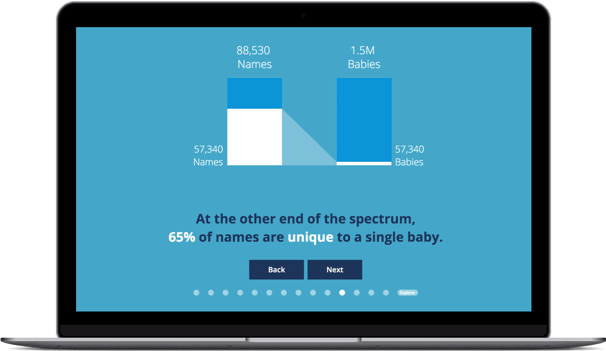 We developed an data driven narrative touring the data set and then allowing users to explore popularity and gender interactions over time. Not surprisingly, the “uniqueness” of names continues to grow. Parents are becoming more adventurous in their naming conventions.