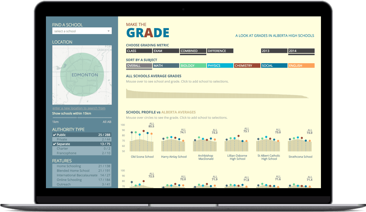 Can we bring additional insight to parents researching schools in their area? The Alberta government hosted the Apps for Alberta competition to encourage the development of creative tools that provide economic or social value using Alberta’s open data. Digging into the available information, we identified a rich data set of high school grades that we felt could be more valuable to the public, especially parents, if it was communicated visually and interactively.