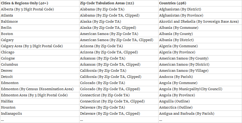 Over 600 city, regional, and country maps exist on MapInSeconds.com, and moreare expected to follow. For each an appropriate projection has already been chosen. You can search the list of maps through the "Region" section of the tool and copy the provided sample data for each map.