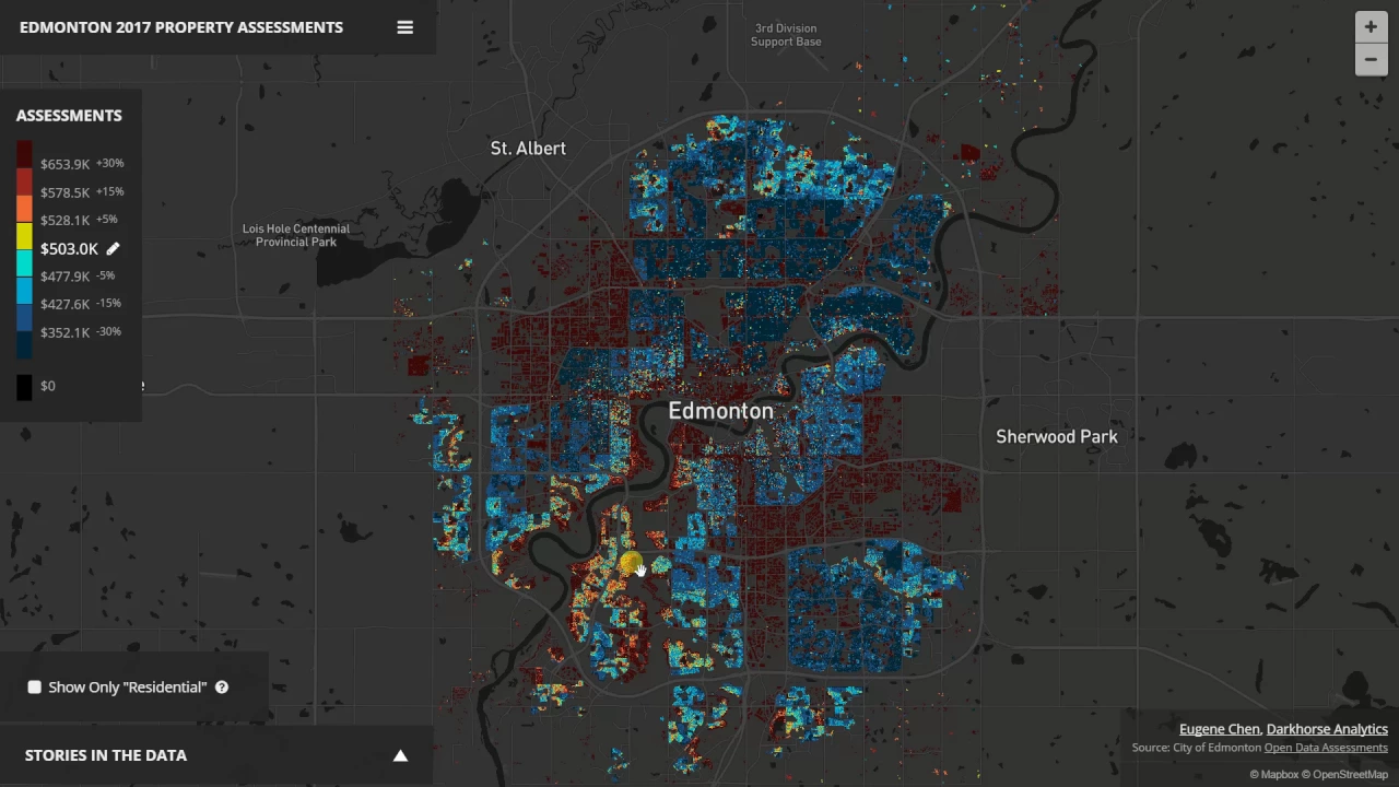 The result is a tool that lets users see the relative pricing of homes very quickly. Simply click on a property to have all other properties coloured relative to your selection. Or click through the guided tour of the city to discover some of the stories we found. There are maps for maps for Edmonton, Vancouver, and San Francisco.